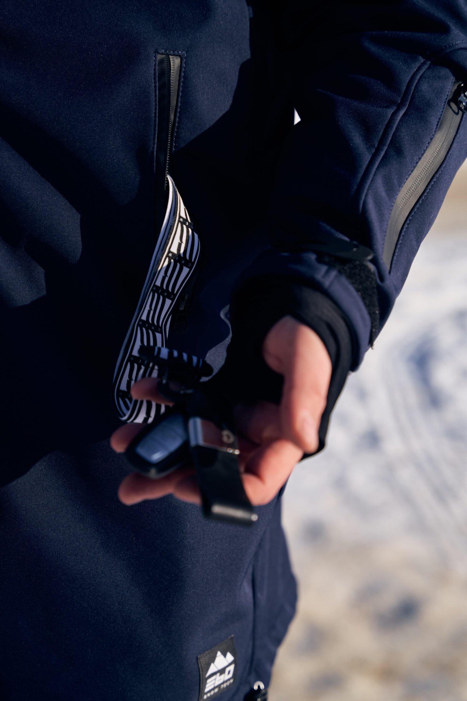 Smycz na klucze z karabinkiem wewnątrz lewej kieszeni.